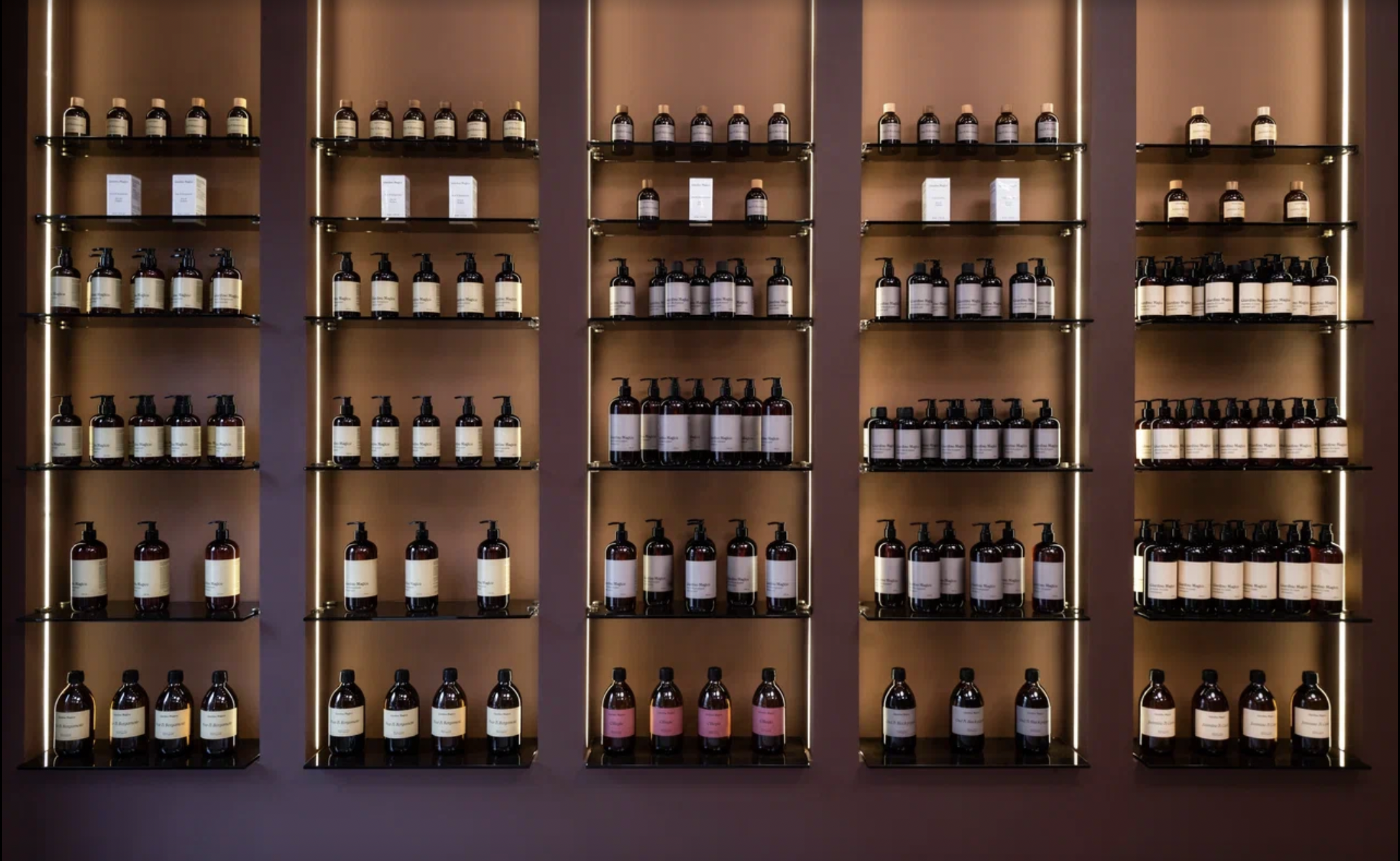 Лаконичный и элегантный интерьер бутика строится на сочетании фирменных природных оттенков и интерпретации знаковых кодов Giardino Magico. В центре бутика — стеклянно-керамический стол-постамент с подсветкой, на котором располагается парфюмерия — ключевой элемент бренда. Форма постамента отсылает к круглой форме крышки всех флаконов Giardino Magico.