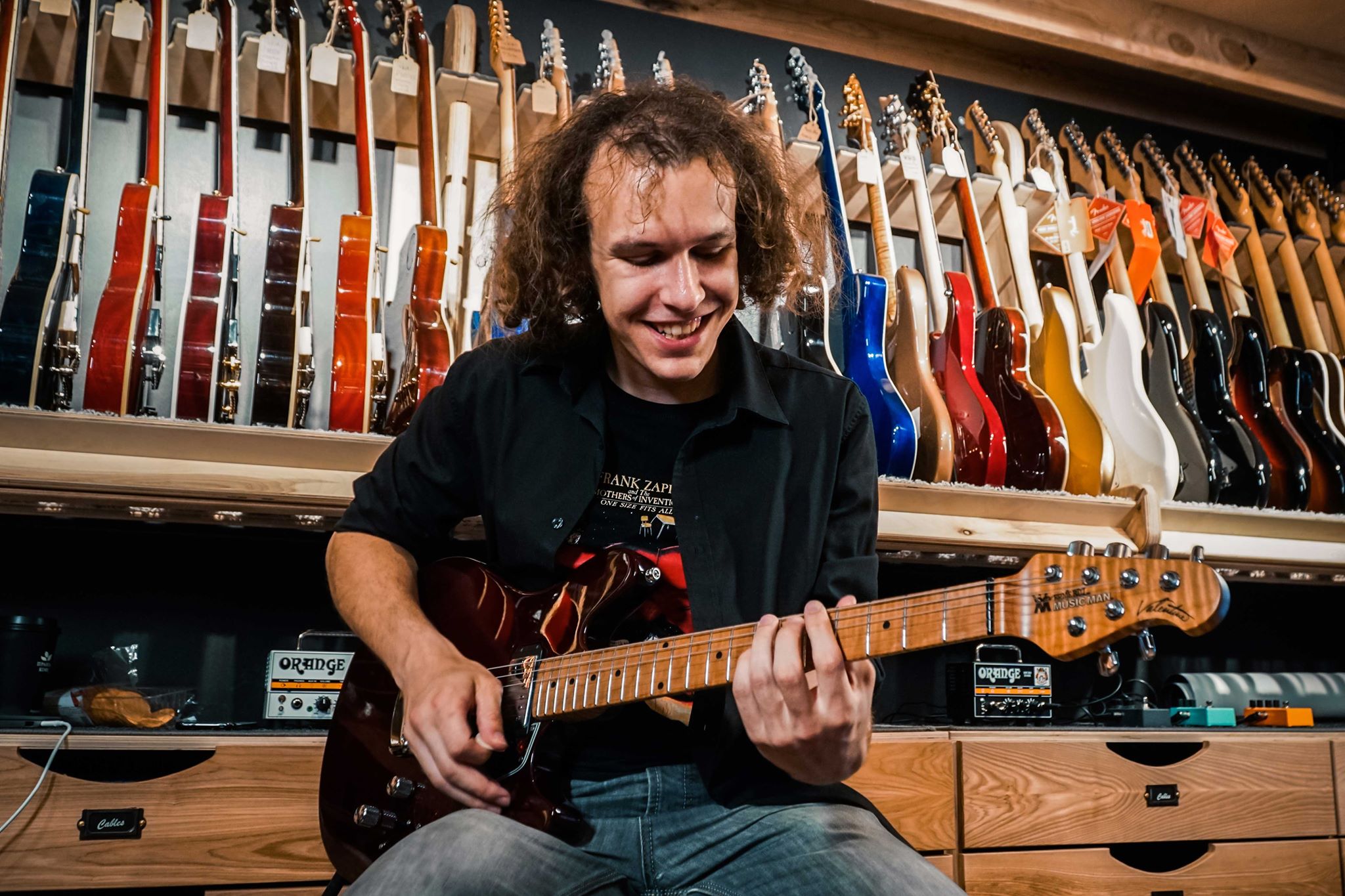 Наши гитары не висят фронтально, они расположены торцами. Это связано с тем, что у нас мало места. Но в этом есть ещё одна хитрость: когда ты заходишь в магазин, ты видишь ценник. Если он тебя не устраивает, ты перестаёшь видеть всё остальное. Это проблема — поэтому у нас нет ценников.