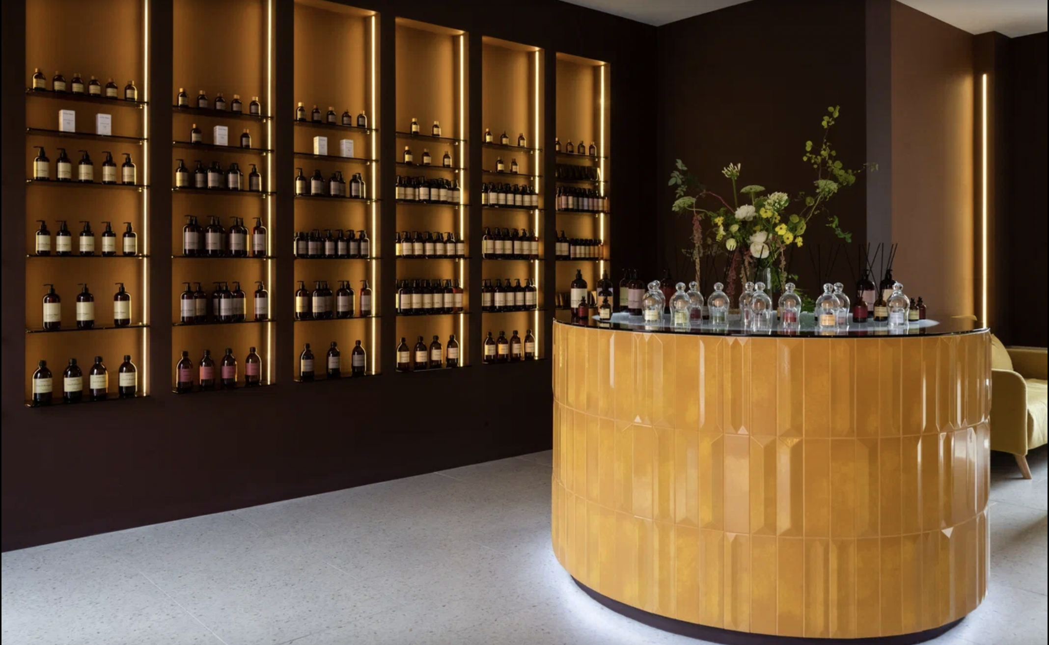 Лаконичный и элегантный интерьер бутика строится на сочетании фирменных природных оттенков и интерпретации знаковых кодов Giardino Magico. В центре бутика — стеклянно-керамический стол-постамент с подсветкой, на котором располагается парфюмерия — ключевой элемент бренда. Форма постамента отсылает к круглой форме крышки всех флаконов Giardino Magico.